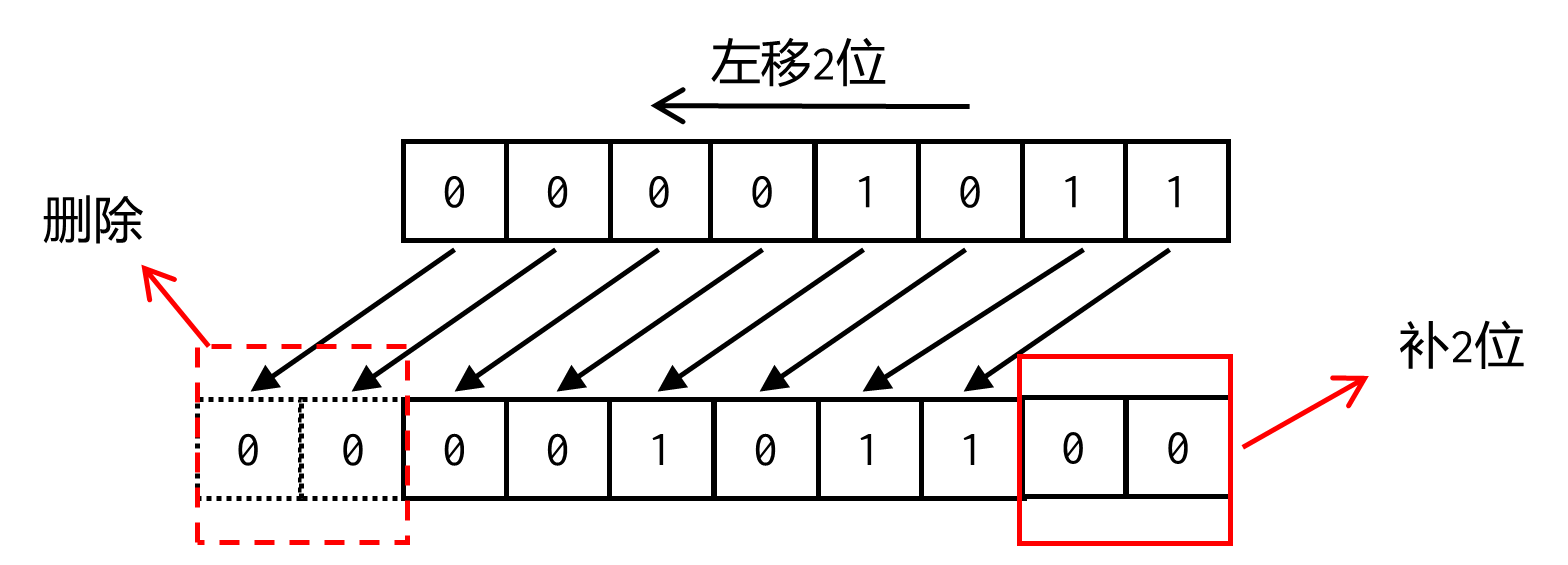 左移操作用来将一个 01 比特串的每一位数字全部左移若干位,右边补 0。