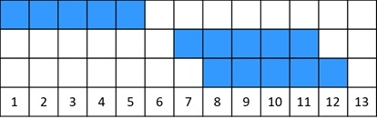 在这个例子中,无敌时间的总长是 11 秒。下图中,从上到下,列举了 3 次光环出现后的无敌持续时间,蓝色表示主角处于无敌状态。