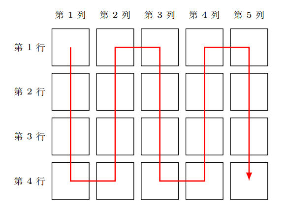 例如,若 n = 4,m = 5,则所有 4 \times 5 = 20 名考生将按照 CSP-J 2025 第一轮成绩从高到低的顺序,根据下图中的箭头顺序蛇形分配座位。